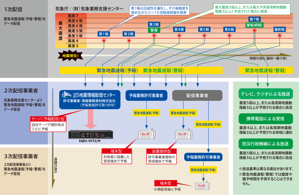 - 気象庁より地震動予報業務許可(第100号)を「配信センターから個別地点への予報提供」および「製造端末による個別地点への予報提供」で取得しております。